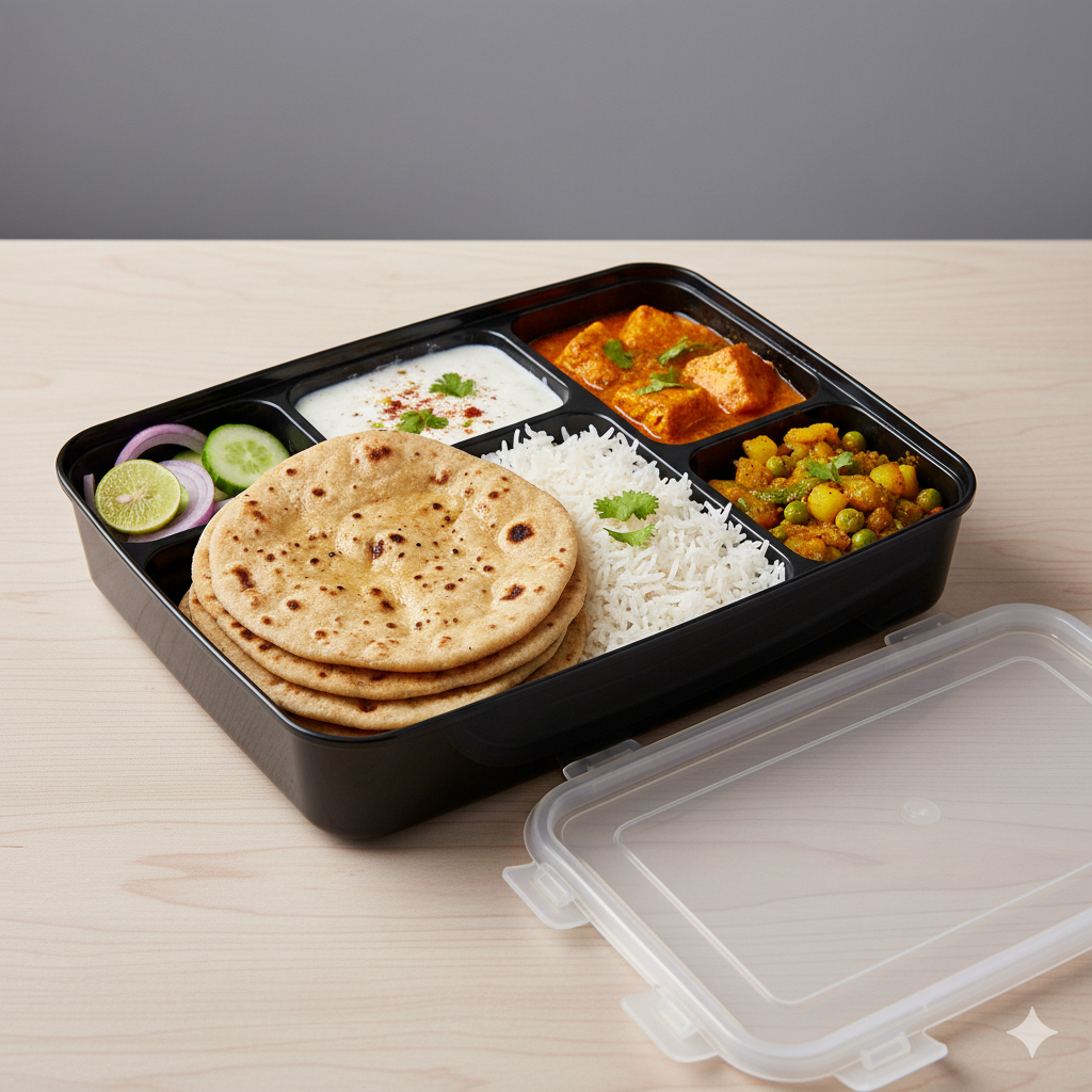 Our menu changes daily, bringing you variety and homely flavors. A typical meal includes: Freshly made roti, Steamed rice, one seasonal sabzi, one Gravy Sabzi, Crisp salad, Sometimes a complimentary beverage to make your meal special.